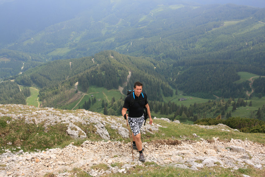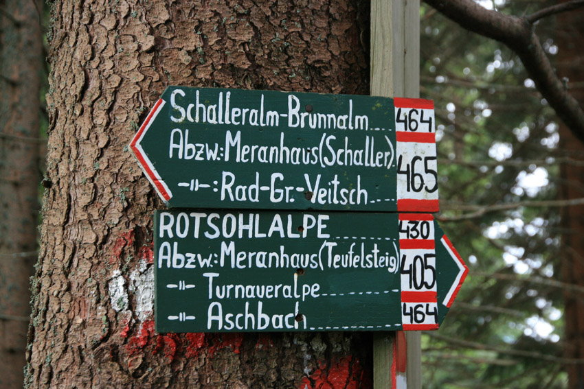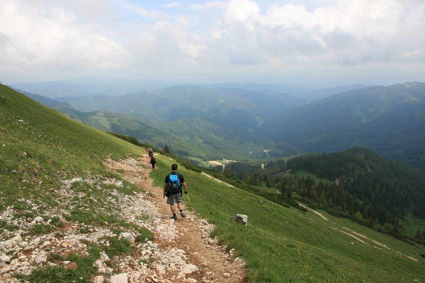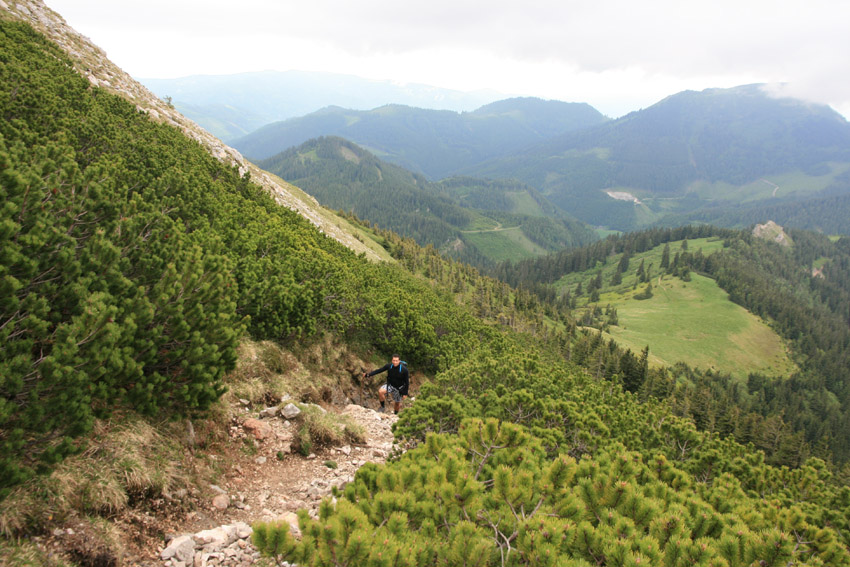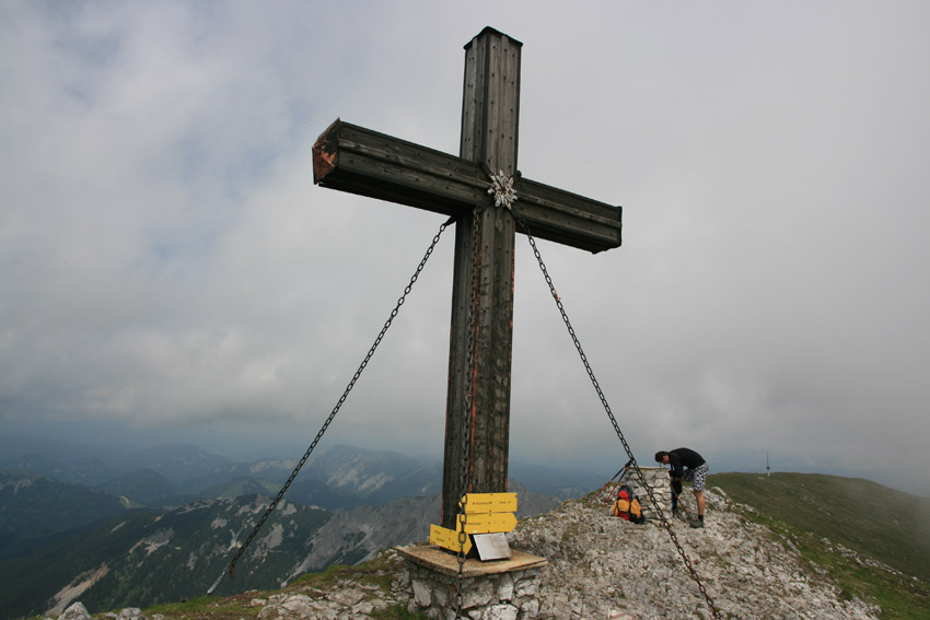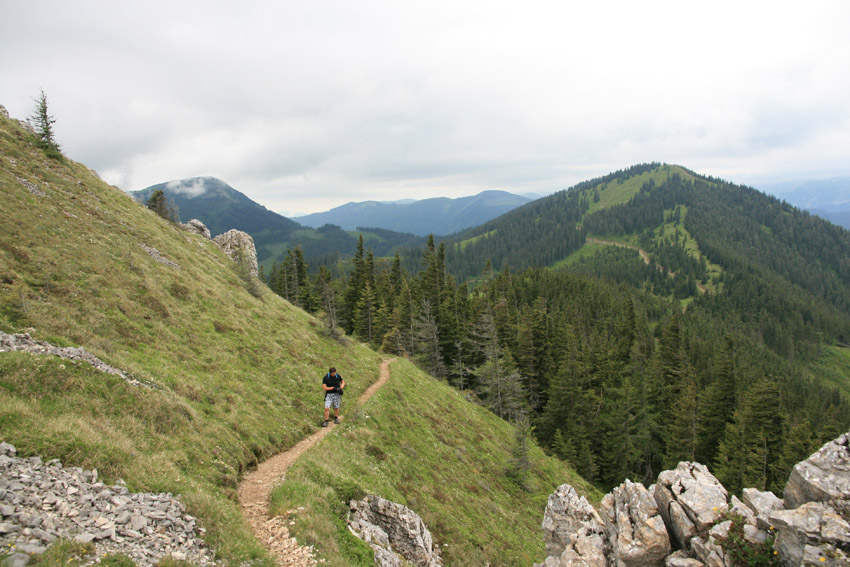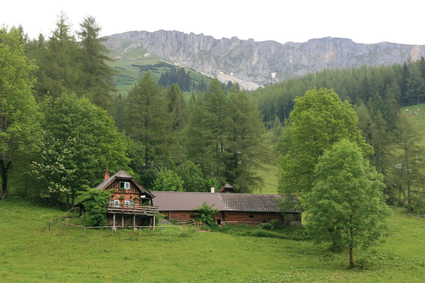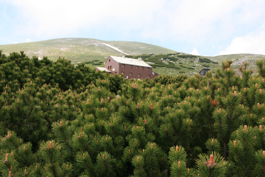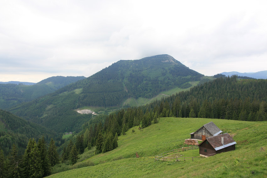 Kurzbeschreibung | Vom Parkplatz auf der Brunnalm über Forststraßen und Waldwege bis zur Rotsohlalm (1413m). Von hier steil auf dem Teufelssteig durch Latschengassen auf die Hochfläche der Veitsch. Dann weiter am Plateaurand entlang bis zum höchsten Punkt Hohe Veitsch mit Gipfelkreuz (1981m). Über Schneefelder zum Graf Meran Haus (1836m) und über den Südhang in Serpentinen wieder zum Parkplatz. |