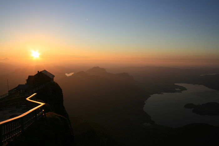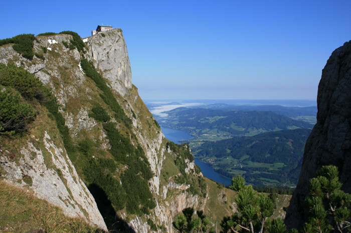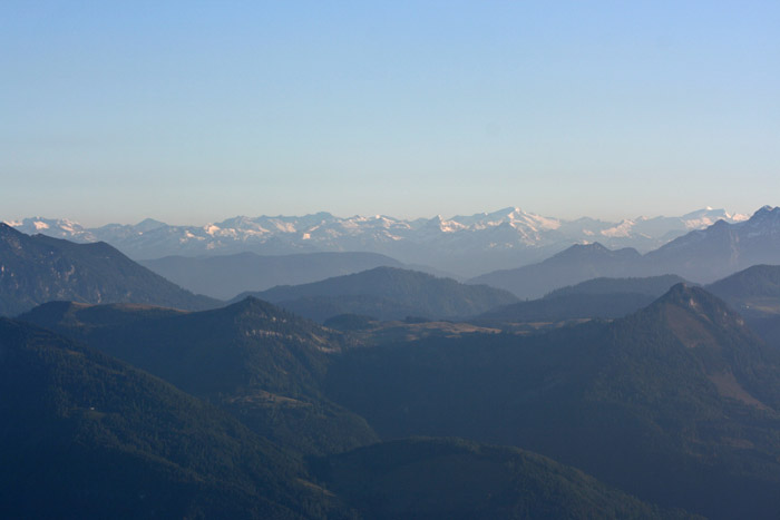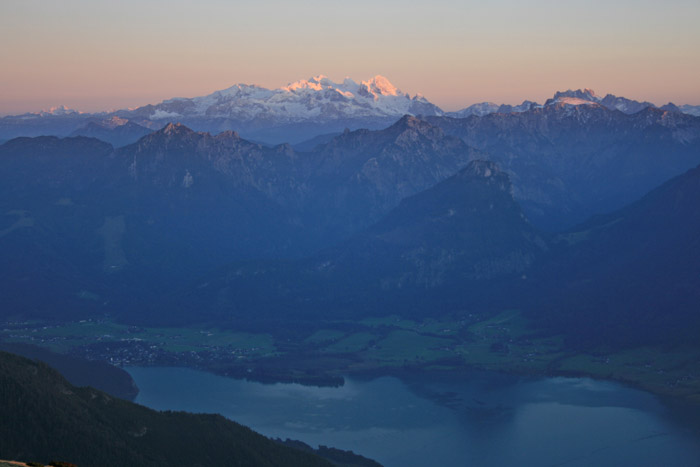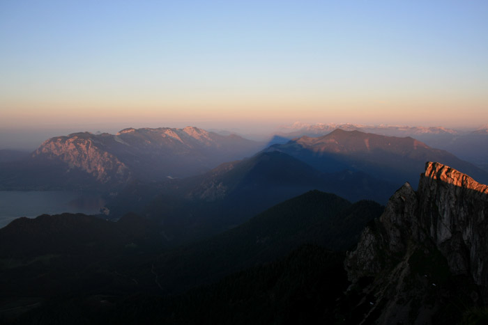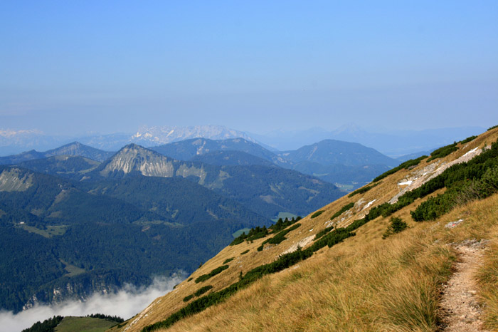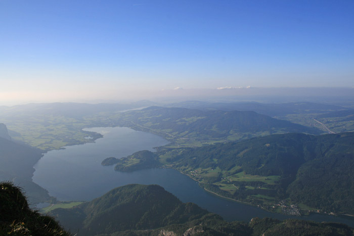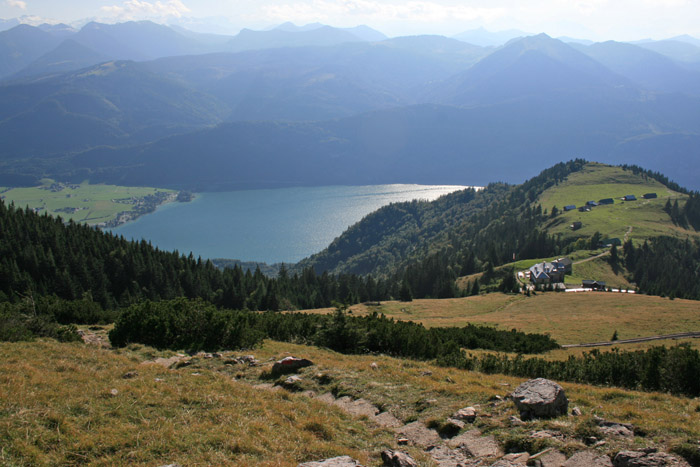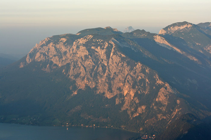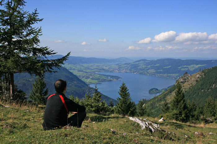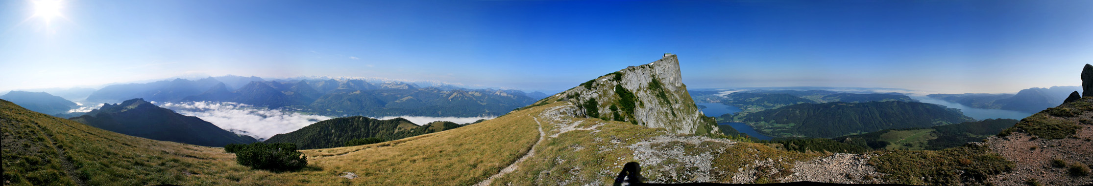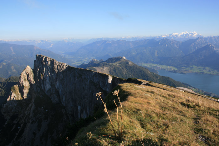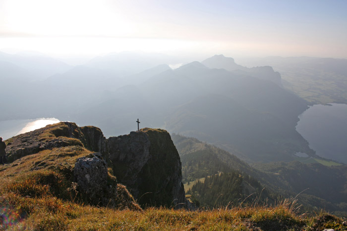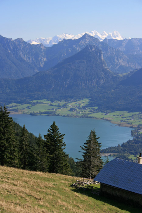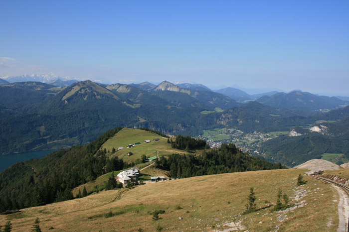 Überwältigend schöne Tour! Von St. Gilgen mit dem Bus nach St. Wolfgang und von dort bis zur Schafbergbahn. Anfangs durch den Wald neben den Bahngleisen durch den Wald zur Schafbergalm (1326m) mit traumhaftem Ausblick zum Mondsee und zur Schafbergspitze. Von dort durch steil aber gut gebares Gelände bis zum Gipfelhotel. Oben erwartete mich ein traumhafter Ausblick auf die Seen und den Dachstein bis zu den Hohen Tauern. Übernachtung im Hotel. Am nächsten Morgen ging es für ein paar Fotos in steiles Gelände Richtung Spinnerin bevor mich die Schafbergbahn bequem ins Tal brachte. |