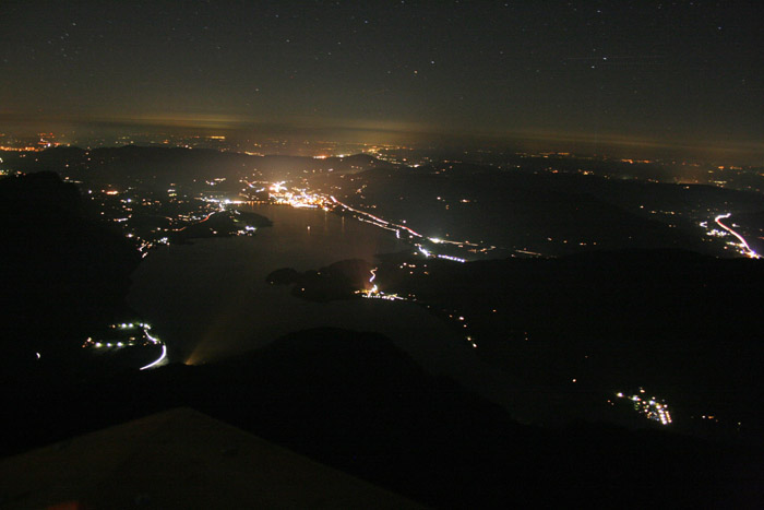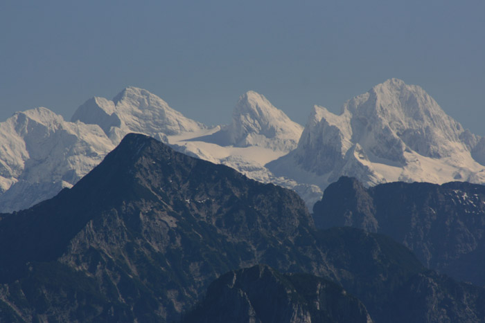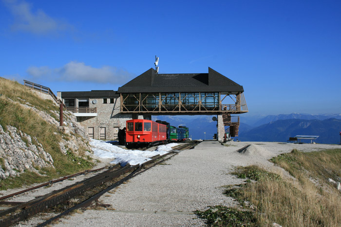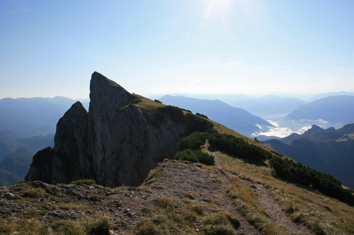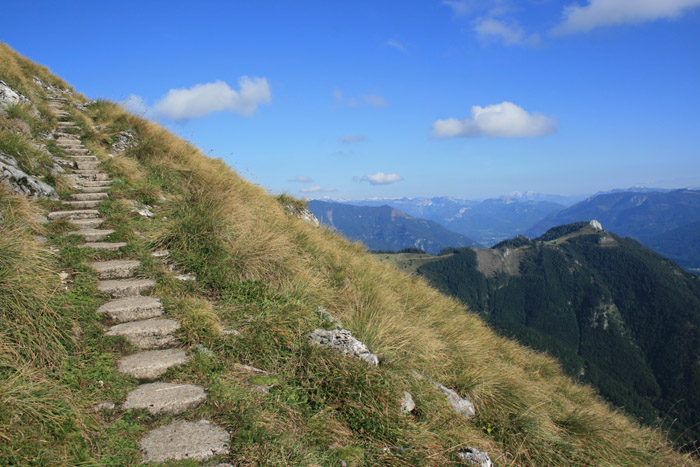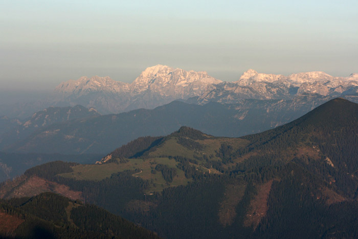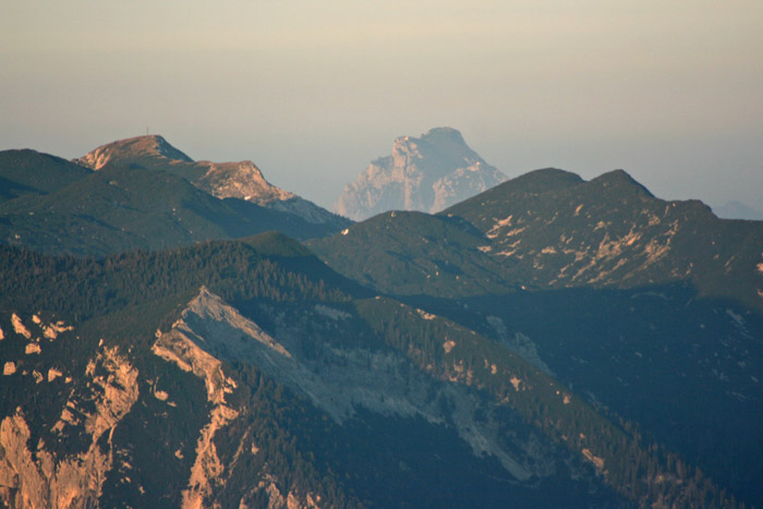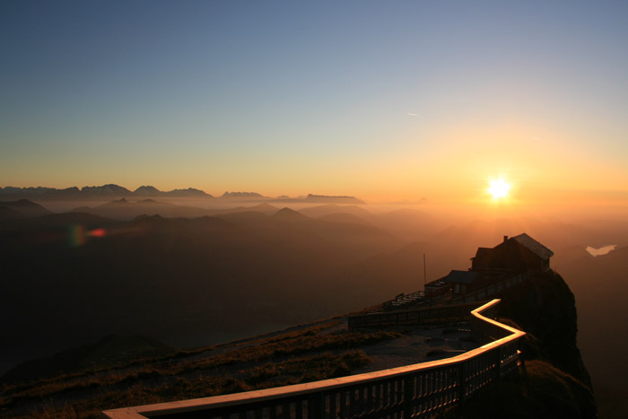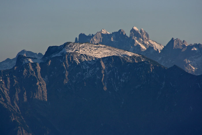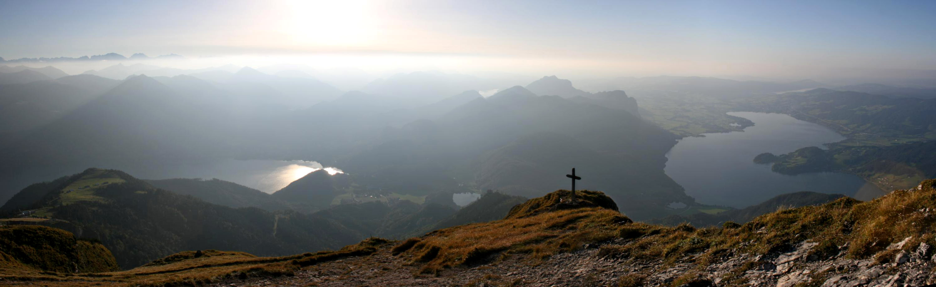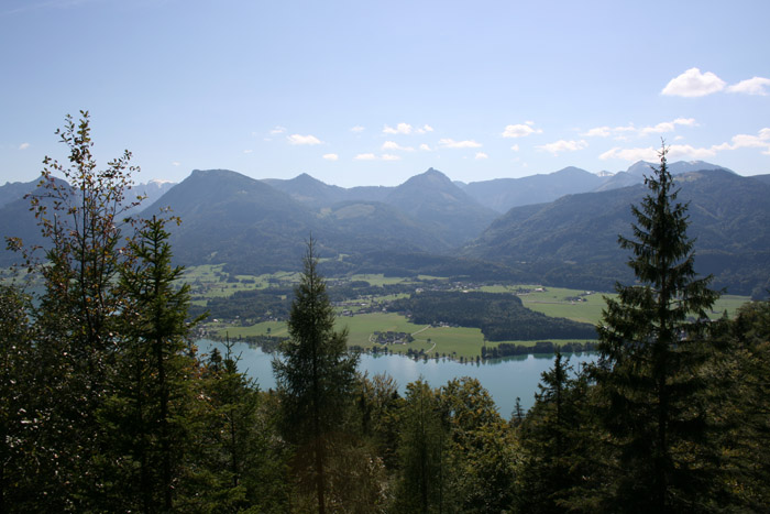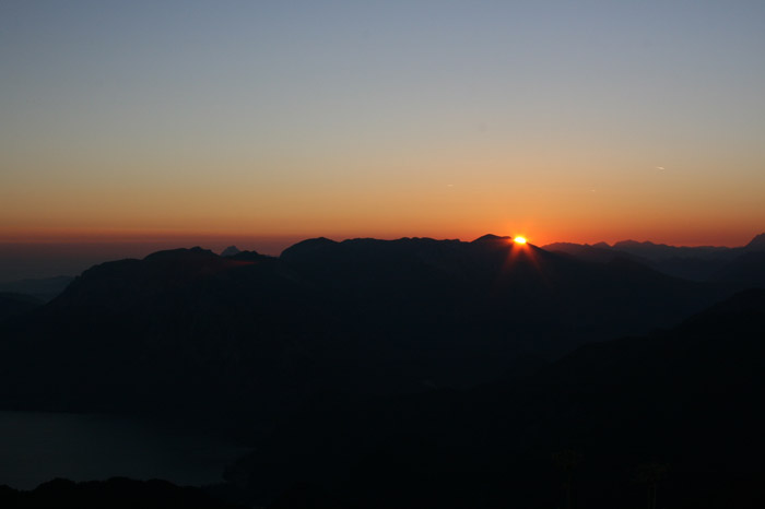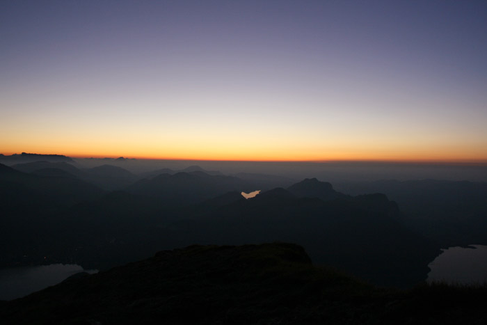 Überwältigend schöne Tour! Von St. Gilgen mit dem Bus nach St. Wolfgang und von dort bis zur Schafbergbahn. Anfangs durch den Wald neben den Bahngleisen durch den Wald zur Schafbergalm (1326m) mit traumhaftem Ausblick zum Mondsee und zur Schafbergspitze. Von dort durch steil aber gut gebares Gelände bis zum Gipfelhotel. Oben erwartete mich ein traumhafter Ausblick auf die Seen und den Dachstein bis zu den Hohen Tauern. Übernachtung im Hotel. Am nächsten Morgen ging es für ein paar Fotos in steiles Gelände Richtung Spinnerin bevor mich die Schafbergbahn bequem ins Tal brachte. |