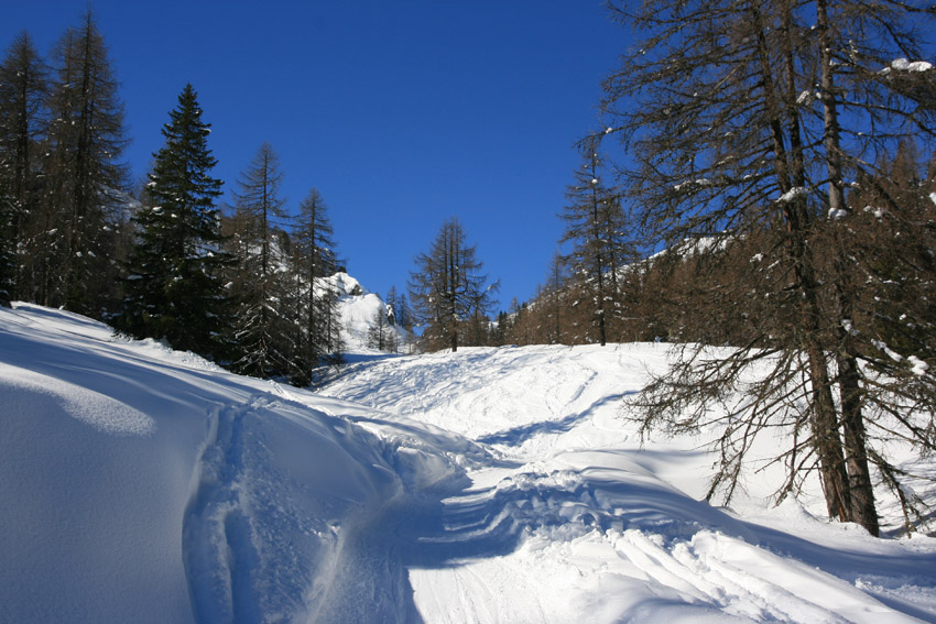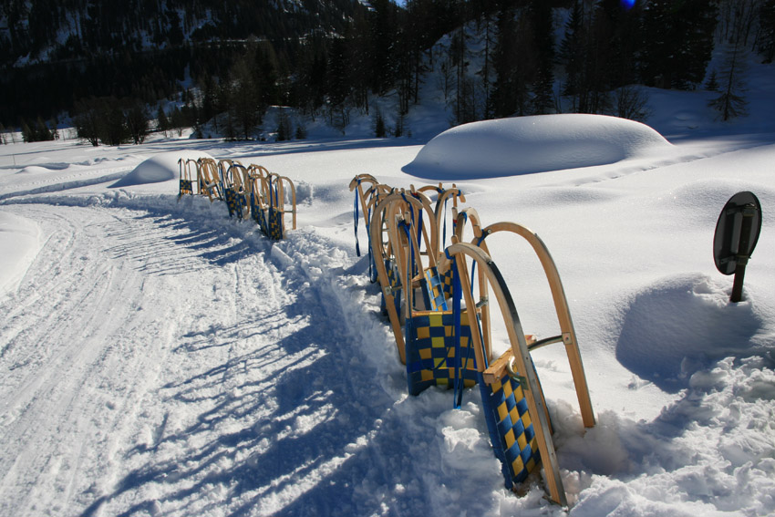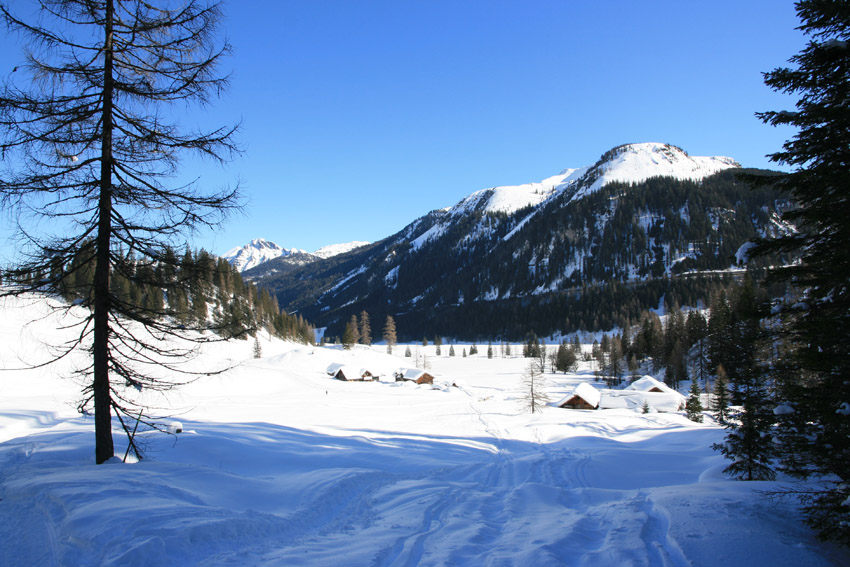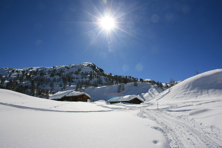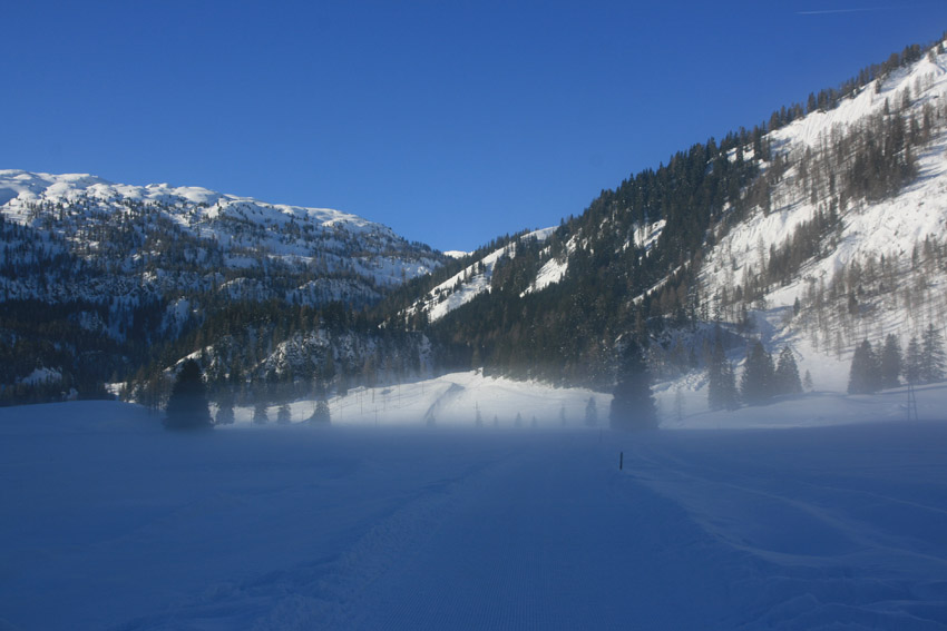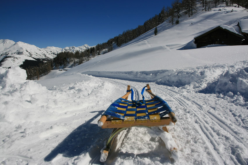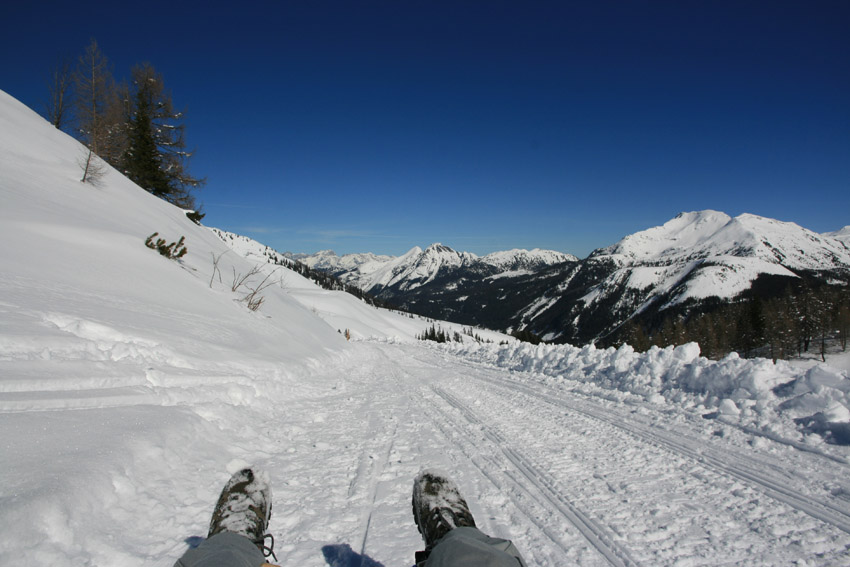 Kurzbeschreibung | Bei eisigen -14°C starte ich mit Schneeschuhen auf der Gnadenalm. Der Weg führt mich zunächst über die Loipe auf der Gnadenalm bis es dann in vielen Kehren hinauf zur Südwienerhütte (1801m) geht. Dabei werde ich immer wieder von Skitourengehern überholt. Das Wetter ist wirklich traumhaft aber das Highlight kommt noch. Ich leihe mir auf der Südwienerhütte eine Rodel und fahre in rasantem Tempo wieder auf der Forststraße zurück. |